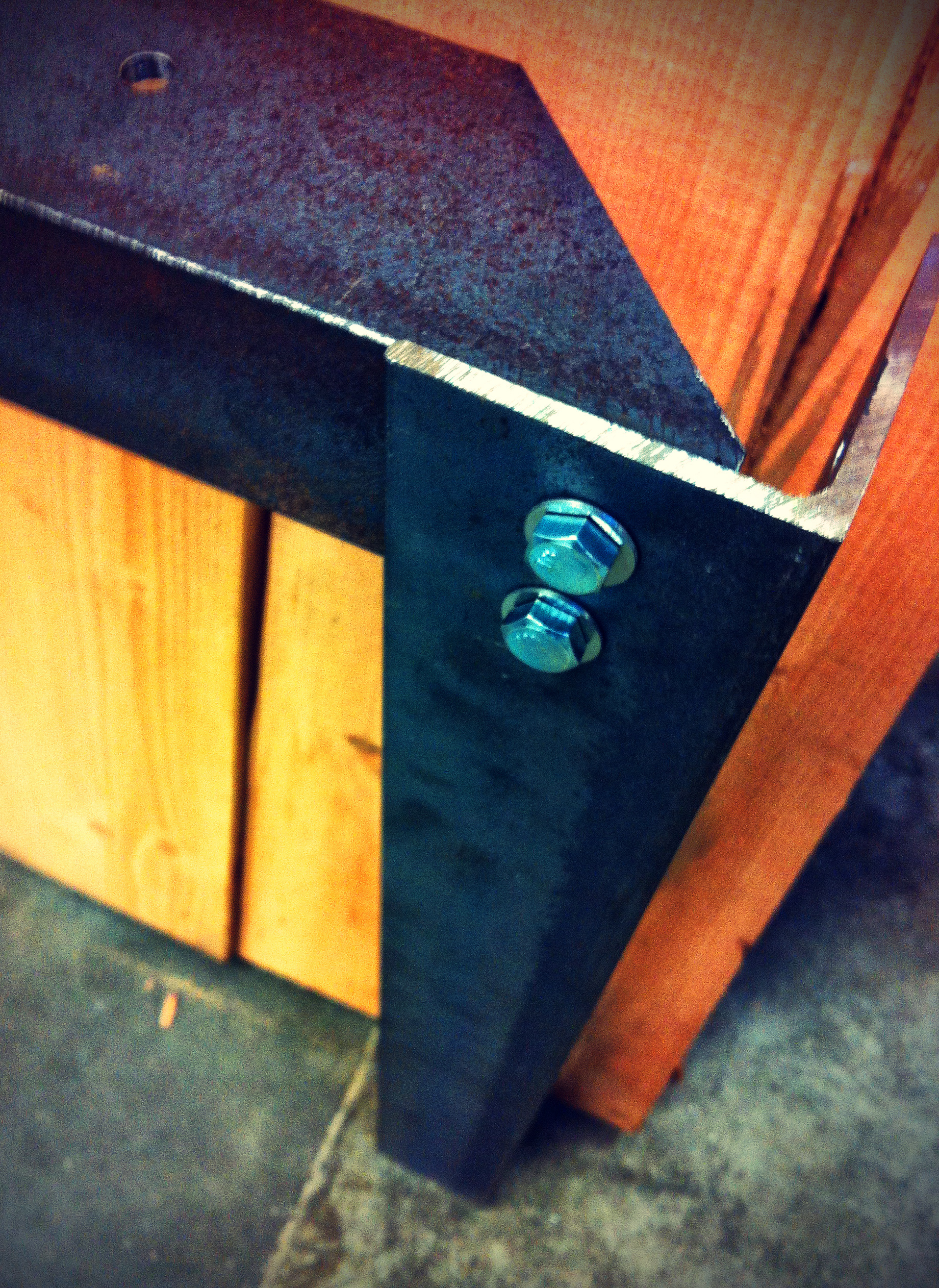 The table and benches were created as a personal project. The wood is Douglas Fir, and was reclaimed from beams in a demolished warehouse in Seattle. The base of the table is created from steel angles that were joined by 1/2" hex head bolts. The legs of the benches are created from 1" square steel tubing with welded joints.